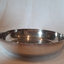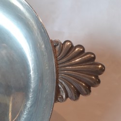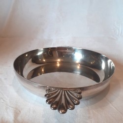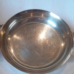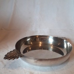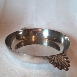 Bol à oreilles, plat à gratin, de 20cm de diamètre et 28,5cm de long, par 4cm de haut, en métal argenté, traces d’usages, rayures, noté « ALLANT AU FOUR », poids 545g