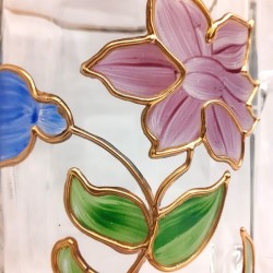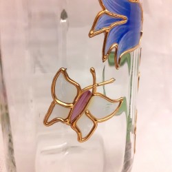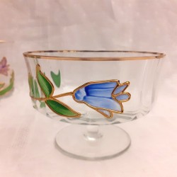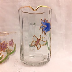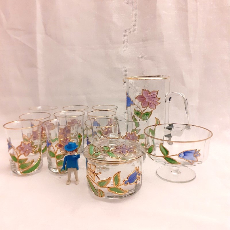 Superbe ensemble de 10 verres, un pot à eau (carafe), une bonbonnière et une coupe de la marque Tiffany entièrement réalisés à la main, travail artisanal, (Reine Handarbeit) NAGEL provenant d’Allemagne, soufflé et peint à la main, travail artisanal de la fin du XX° siècle, dans un état impressionnant, comme neuf, chacun des éléments est à facettes,