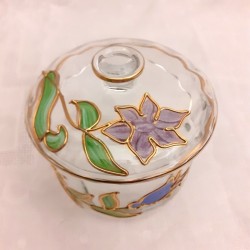 Dimensions : verres d’environ 18cL, 10,2cm de haut et 7,5cm de diamètre au col, 200g pièce ; bonbonnière : 10cm de haut, diamètre couvercle environ 11cm, poids : 360g ; coupe : hauteur 9cm, diamètre 13cm, poids : 225g ; pot de plus d’1L de contenance 18,5cm de haut, 11cm de diamètre (sans la anse) 1kg.