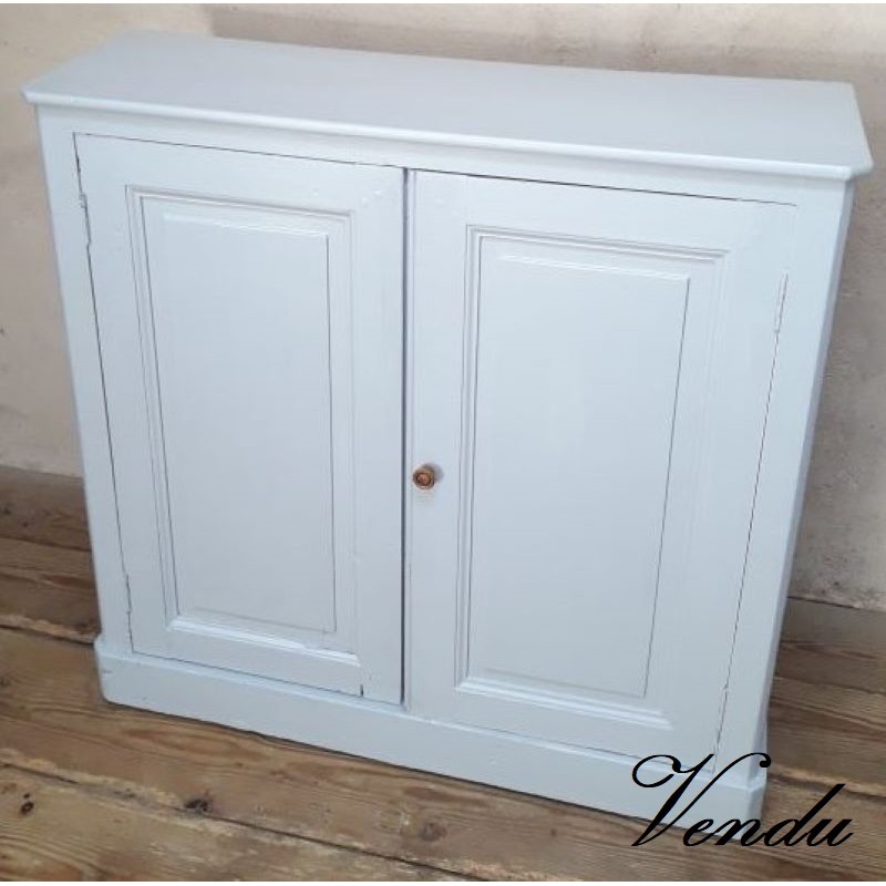 Petit buffet en sapin peint (bleu-gris), 2 portes, ouvrant sur un espace de rangement contenant deux étagères et une séparation verticale.