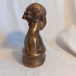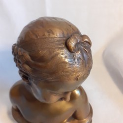 Petit buste de fillette souriante tête penchée, pleine de malice, sculpture en bronze du XX° siècle, portant l’inscription « ORFE LYON FONDERIE D’ART » à l’arrière du socle,