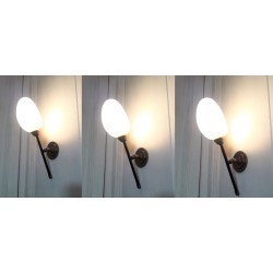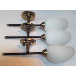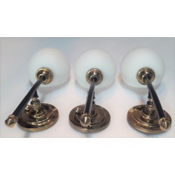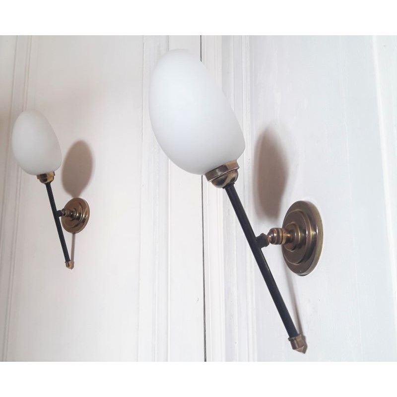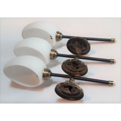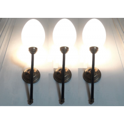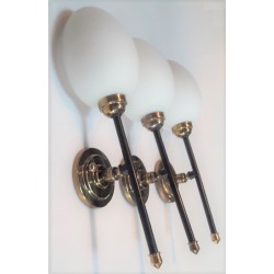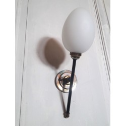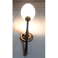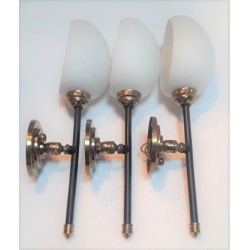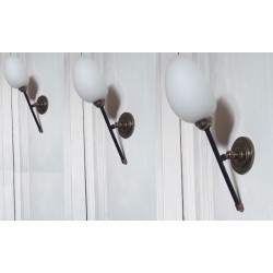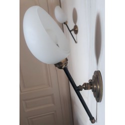 Montures en bronze et laiton poli, verni or, bras en métal laqué noir, et applique en verre opalin, modèle Concorde.