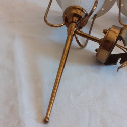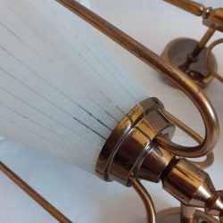 structure tubulaire laitonnée, à trois bras qui englobe les verres givrés, granités, avec alternance de parties lisses et transparentes, dorés en partie haute, et se rejoignent sur les chapeaux en tôles perforées, ajourées et peintes en noir à l’extérieur et crème à l’intérieur.