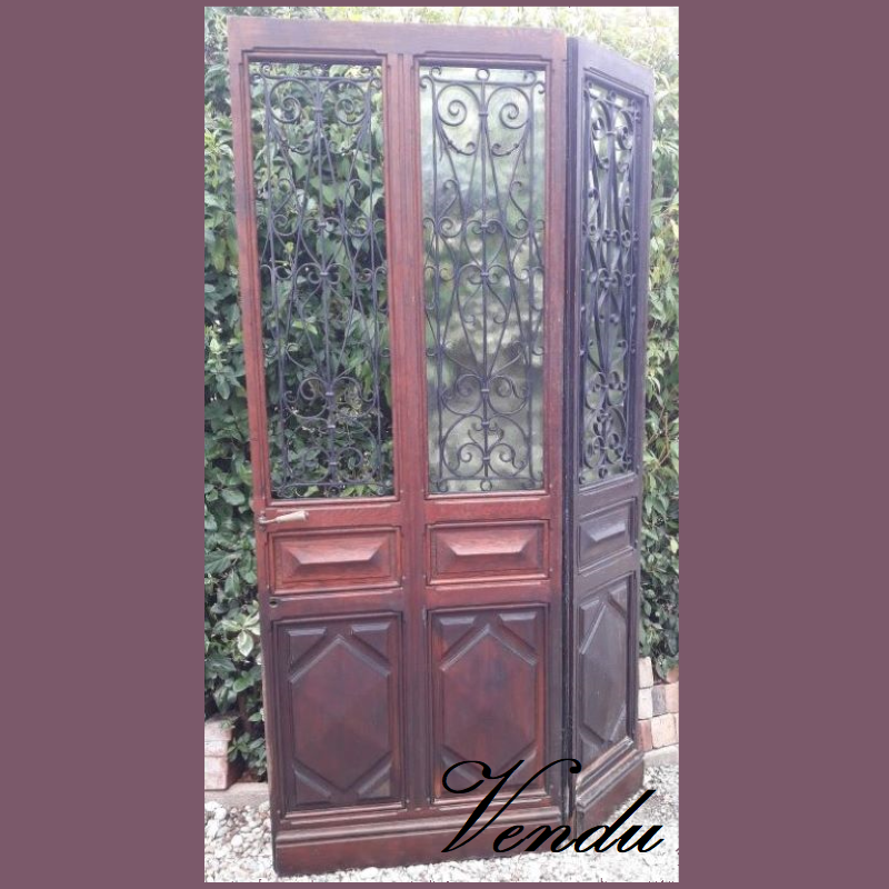 La partie basse est à soubassement et à panneaux sculptés et moulurés, avec sa plinthe moulurée. La partie haute présente une grande partie vitrée permettant une entrée lumineuse. Elle est composée de 3 grilles identiques en fer forgé (115cm de haut par 34,5cm de large), peintes en noir, et est munie de deux verres translucides, granités, sur les 3 initiaux (117cm de haut par 36cm de large). Nous avons décidé de ne pas remplacer le verre manquant, laissant ainsi le choix à l’acquéreur en fonction de l’utilisation souhaitée, de passer la totalité en double vitrage, ou dans un autre style de verres.