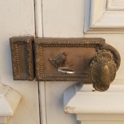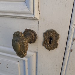 Elle est munie de sa quincaillerie en bronze doré avec sa serrure et sa gâche à petite répétition, son cache clé, ses poignées, et son entrée de serrure, mais également ses verrous haut et bas encastrés avec leurs boutons ciselés peints. La clé est présente et la serrure fonctionne.