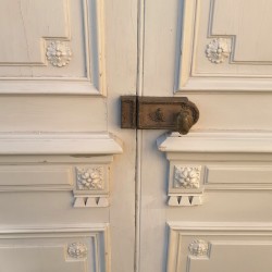La double porte montée à grand cadre, présente des moulures grasses, et est agrémentée d’éléments sculptés, rosaces, décors géométriques, qui rythment brillamment l’ensemble et lui confère des proportions harmonieuses.