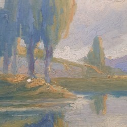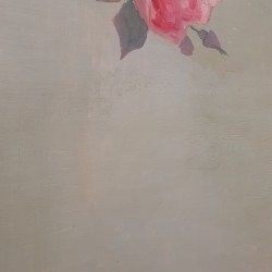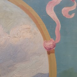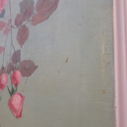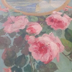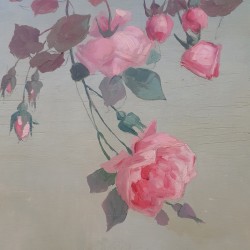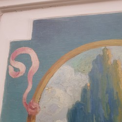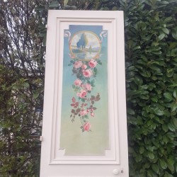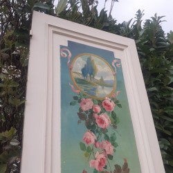Dans celui du haut, paysage lacustre en tondo, enrubanné, d’où tombe un bouquet de branchages de roses en boutons et épanouies sur un fond dégradé de bleu vert que l’on retrouve sur les 3 panneaux, teintes douces et fraîches, décor pastel et reposant rythmé et cadencé par les plates bandes à angles droits rentrants.