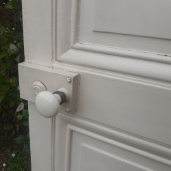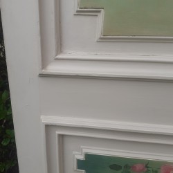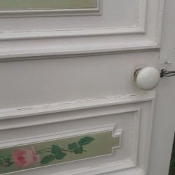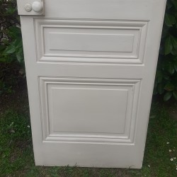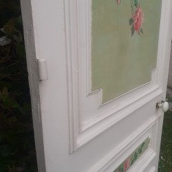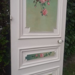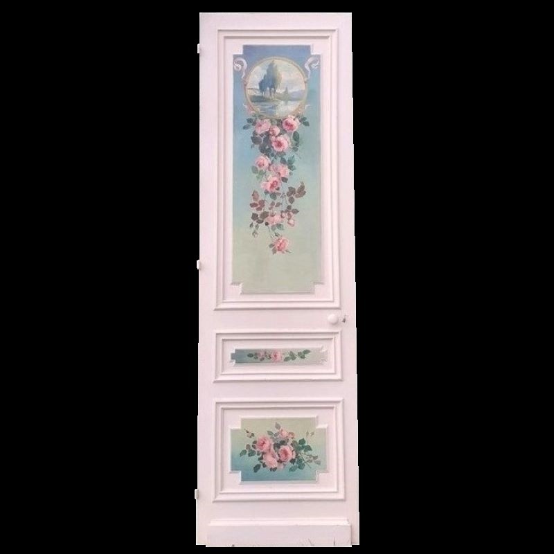 Montée à grand cadre, poussant droit, elle présente des moulures saillantes et 3 magnifiques panneaux peints d’origine sur une face, elle est munie de ses poignées rondes en faïence, de sa serrure et de sa clé qui fonctionne.