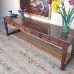 Au vu de sa hauteur sous traverse elle ne peut être utilisée telle qu’elle qu’en console, bien évidement les pieds pourraient être rallongés comme c’est toujours le cas pour ces tables de cette époque, mais nous avons préféré vous la présenter ainsi, lui conservant toute son authenticité ! Pour cette même raison nous avons décidé de laisser les importantes traverses en bas de pieds rajoutées au XIX° siècle. Tiroirs restaurés, quelques trous de vers traités comme toujours.