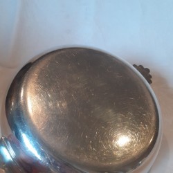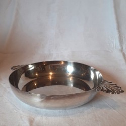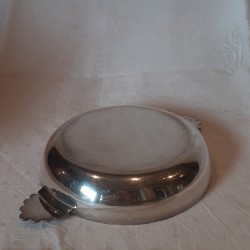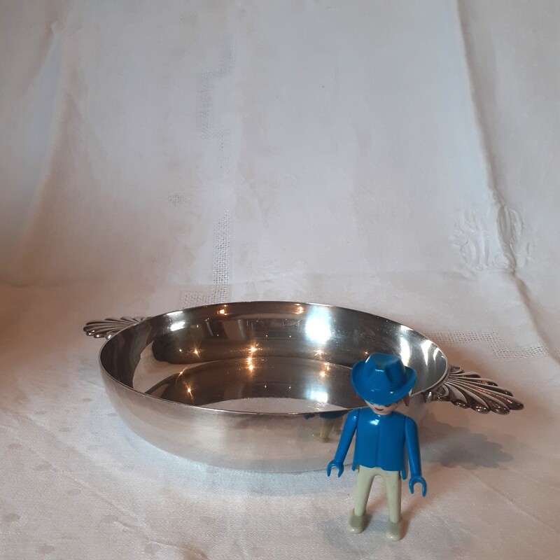 Bol à oreilles, plat à gratin, de 20cm de diamètre et 28,5cm de long, par 4cm de haut, en métal argenté, traces d’usages, rayures, noté « ALLANT AU FOUR », poids 545g