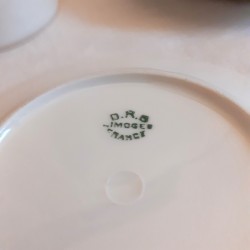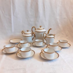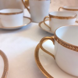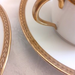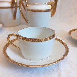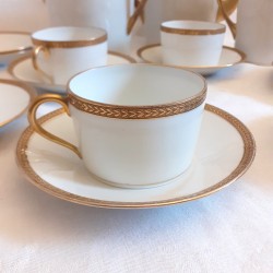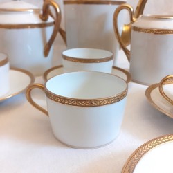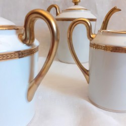 Service à thé de style Empire du XX°, Limoges France, DRB Descotte, Reboisson & Barranger datant des années 1920, comprenant théière, sucrier, pot à lait, 7 tasses à thé et 9 sous tasses.