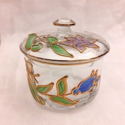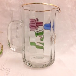 Dimensions : verres d’environ 18cL, 10,2cm de haut et 7,5cm de diamètre au col, 200g pièce ; bonbonnière : 10cm de haut, diamètre couvercle environ 11cm, poids : 360g ; coupe : hauteur 9cm, diamètre 13cm, poids : 225g ; pot de plus d’1L de contenance 18,5cm de haut, 11cm de diamètre (sans la anse) 1kg.