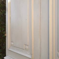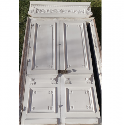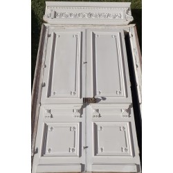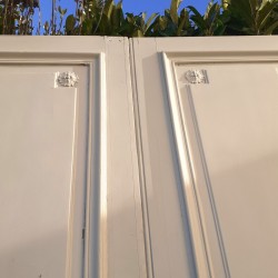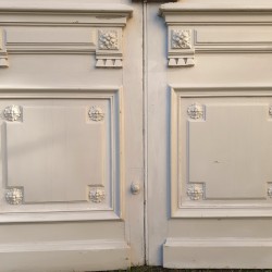Leur couronnement remarquable de 171cm de large au panneau et 175cm au plus large (en bas), affiné par ses écoinçons en plâtre à enroulements est agrémenté d’une belle frise d’arabesques, entrelacs, de rinceaux de feuilles d’acanthe et de fleurs, et sous la corniche d’un ornement à décor de denticules et d’oves.