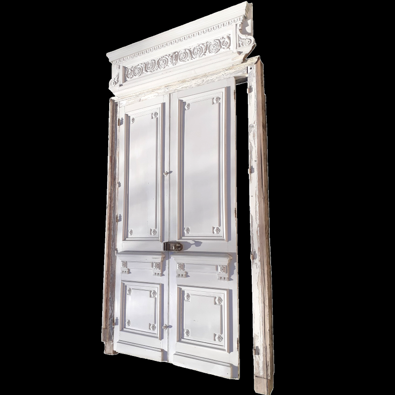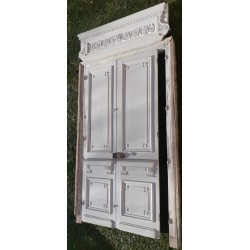 Très belle double porte intérieure de 268cm de haut et 140cm de large et son imposant fronton mouvementé en bois et stuc, de 57cm de haut et 171cm de large, d’époque Napoléon III, munie de toute sa quincaillerie en bronze doré repeint, finement ciselé, proposés avec un massif cadre plus ancien (entièrement dégrossi à l’herminette) qui pourra être adapté (largeur à ajuster, moulures…)