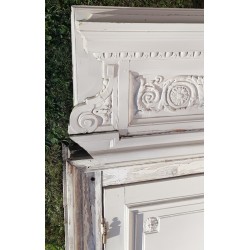 L’ensemble de la menuiserie en bois blanc, peint, est en très bel état, le fronton en deux parties sera à refixer à la pose, sur celui-ci une greffe est visible à droite en bas, de façon plus générale, seuls sont à noter quelques défauts dus à son ancienneté et son usage: légers accrocs, éclats de peinture et endroits où elle s'écaille, essentiellement sur une des faces.