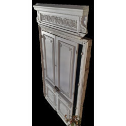 La double porte montée à grand cadre, présente des moulures grasses, et est agrémentée d’éléments sculptés, rosaces, décors géométriques, qui rythment brillamment l’ensemble et lui confère des proportions harmonieuses.