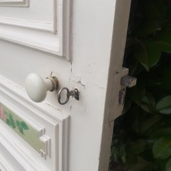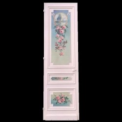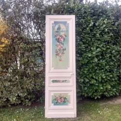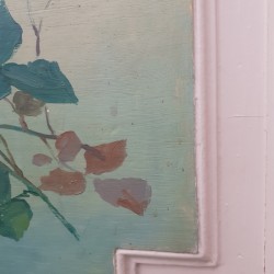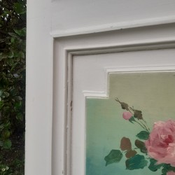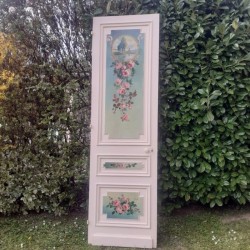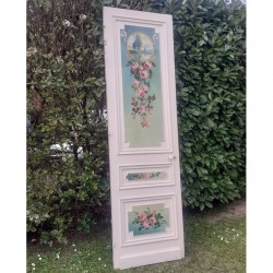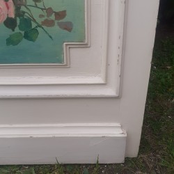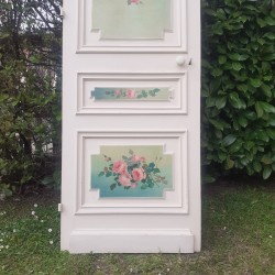Montée à grand cadre, poussant droit, elle présente des moulures saillantes et 3 magnifiques panneaux peints d’origine sur une face, elle est munie de ses poignées rondes en faïence, de sa serrure et de sa clé qui fonctionne.