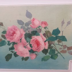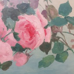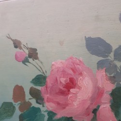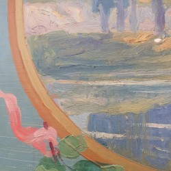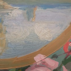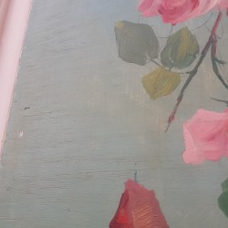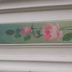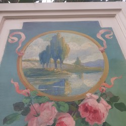 Dans celui du haut, paysage lacustre en tondo, enrubanné, d’où tombe un bouquet de branchages de roses en boutons et épanouies sur un fond dégradé de bleu vert que l’on retrouve sur les 3 panneaux, teintes douces et fraîches, décor pastel et reposant rythmé et cadencé par les plates bandes à angles droits rentrants.