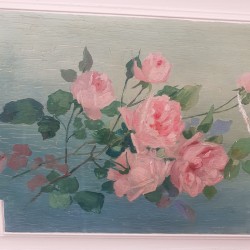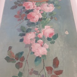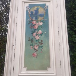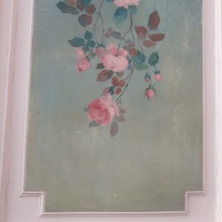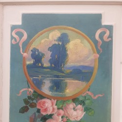 Dans celui du haut, paysage lacustre en tondo, enrubanné, d’où tombe un bouquet de branchages de roses en boutons et épanouies sur un fond dégradé de bleu vert que l’on retrouve sur les 3 panneaux, teintes douces et fraîches, décor pastel et reposant rythmé et cadencé par les plates bandes à angles droits rentrants.