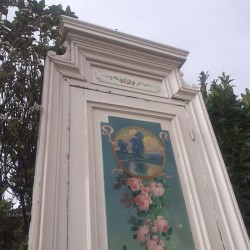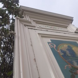 Son couronnement remarquable affiné par ses écoinçons en plâtre à enroulements est agrémenté d’un panneau peint d’une frise de feuilles et fleurs de volubilis ou ipomées roses sous un large chapiteau.