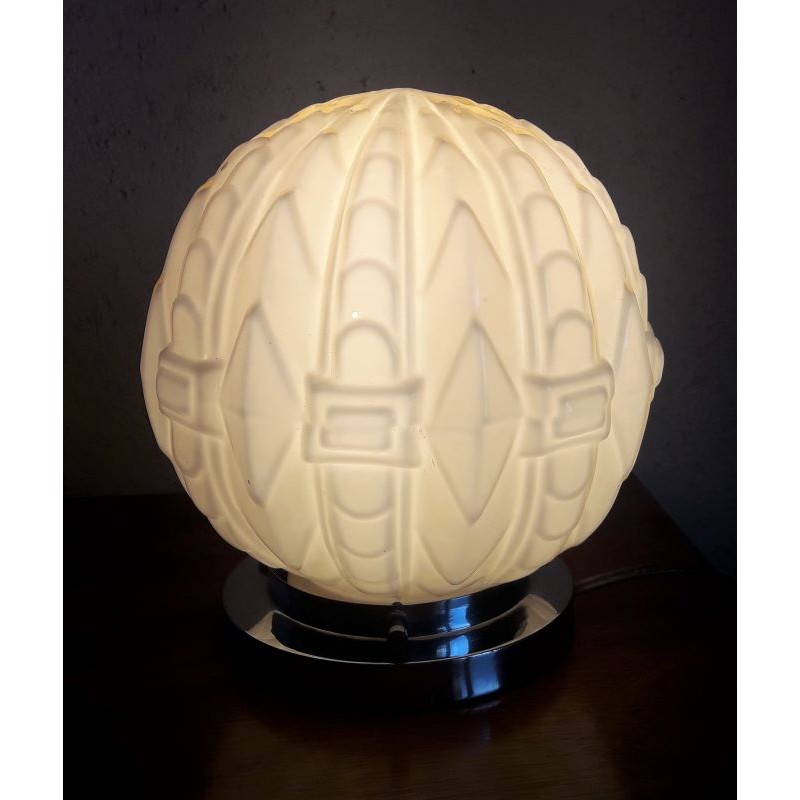 Authentique lampe à poser Art Déco, du tout début du XX° siècle, certainement des années 1920, socle typiquement Art Déco en métal chromé et magnifique globe en verrerie à décor de formes géométriques à fort relief terminant en pointe.Verre moulé, teinte beige, donne de très beaux effets de lumière éteint comme éclairé.