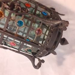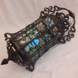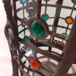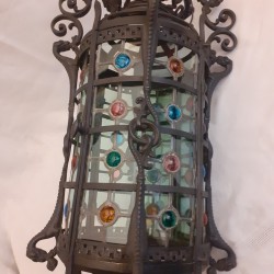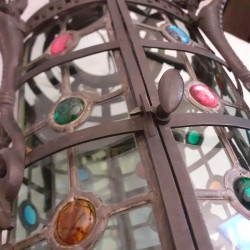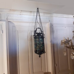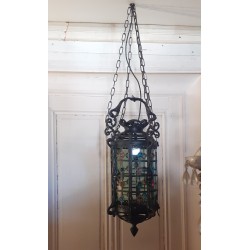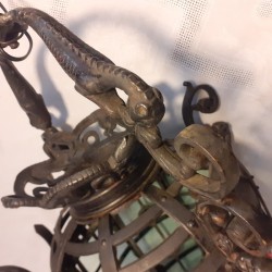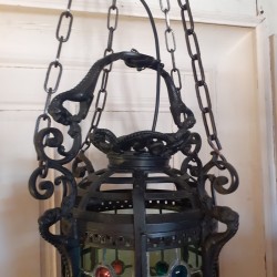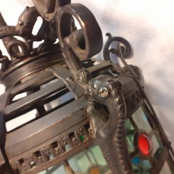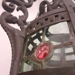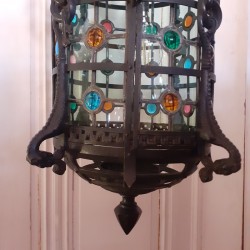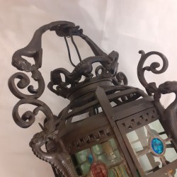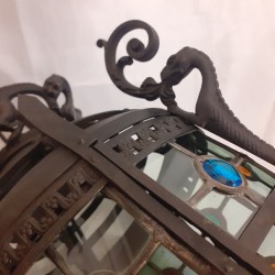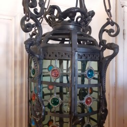 Surprenante lanterne en bronze à patine brune, munie de ses vitraux, d’époque Napoléon III,