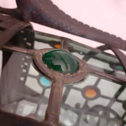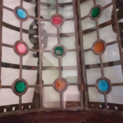 Les 4 vitraux incurvés sont fixés par des languettes métalliques à la structure, ils sont constitués chacun de 8 cabochons colorés vert bleu rose et orange, organisés en spirale et de 32 morceaux de verre teintés ajustés à la forme, chaque morceau étant inséré dans son chemin de plomb, ceux de la partie droite de la porte sont légèrement sortis de celui ci mais sans risque de déboîtement, les vitraux sont entiers et en superbe état !, avec de magnifiques reflets,