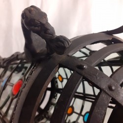Structure en bronze, en forme de cage d’esprit médiéval, surmontée d’enroulements animaliers, dragons et terminant en pointe à facettes.
