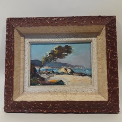 Huile sur panneau représentant un bord de côte, attribuée à Louis Bissinger, peintre lyonnais, 1899-1978, dans son cadre bordeaux, beige et blanc.